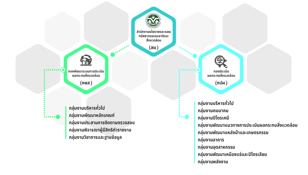 ได้แก่ กองพัฒนาระบบการวิเคราะห์ผลกระทบสิ่งแวดล้อม และกองวิเคราะห์ผลกระทบสิ่งแวดล้อม