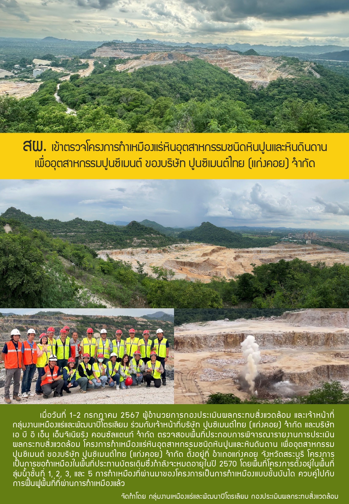 สผ. เข้าตรวจโครงการทำเหมืองแร่หินอุตสาหกรรมชนิดหินปูนและหินดินดาน เพื่ออุตสาหกรรมปูนซีเมนต์ ของบริษัท ปูนซีเมนต์ไทย (แก่งคอย) จำกัด