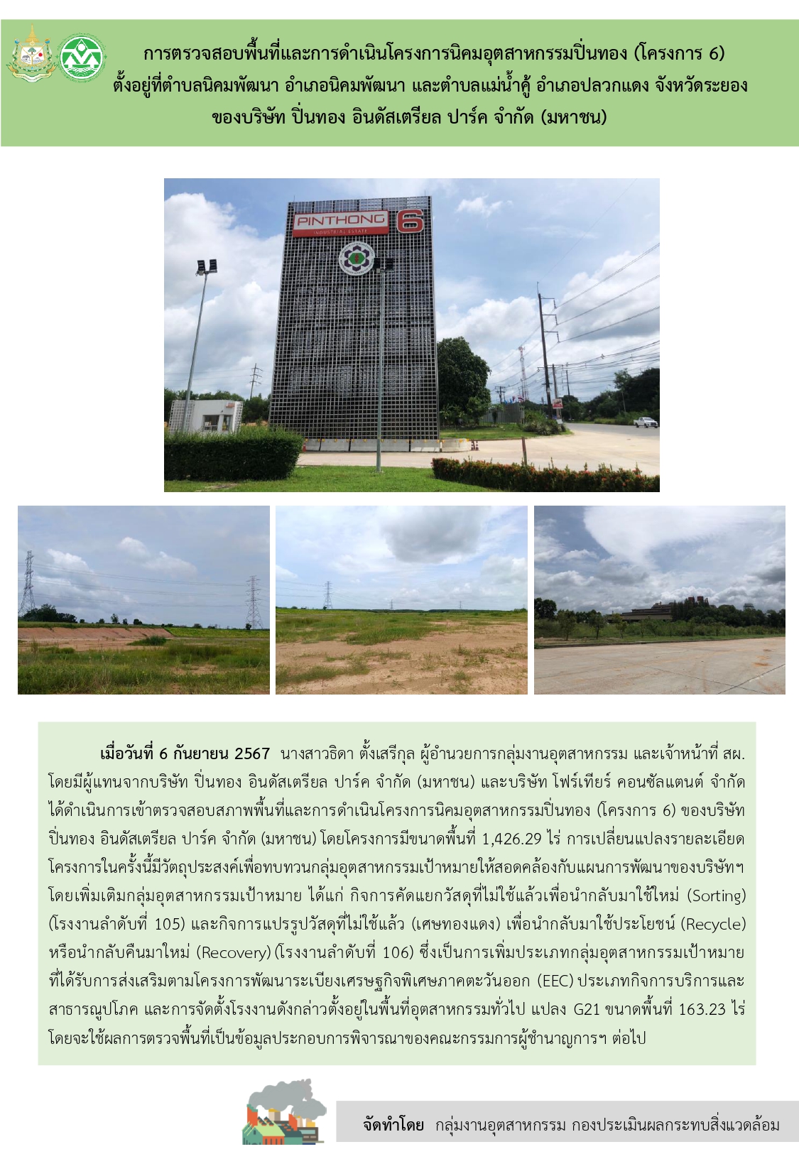 การตรวจสอบพื้นที่และการดำเนินโครงการนิคมอุตสาหกรรมปิ่นทอง (โครงการ 6)