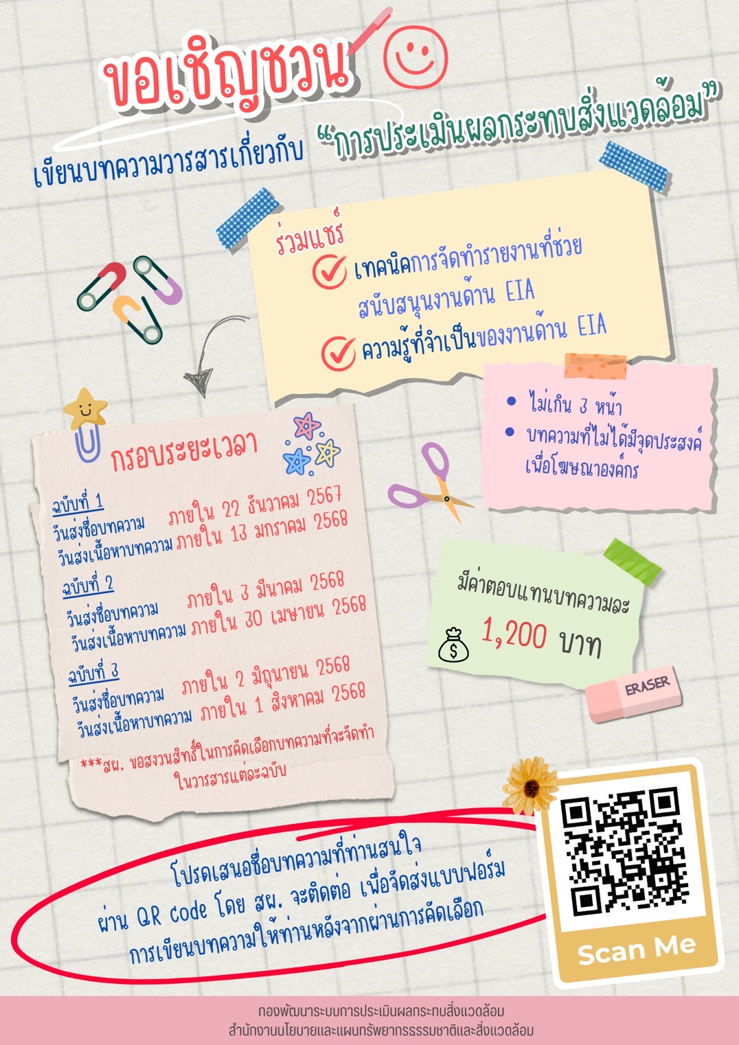 ขอเชิญชวนส่งบทความเพื่อตีพิมพ์ในวารสารข่าว สผ. หมวดการประเมินผลกระทบสิ่งแวดล้อม