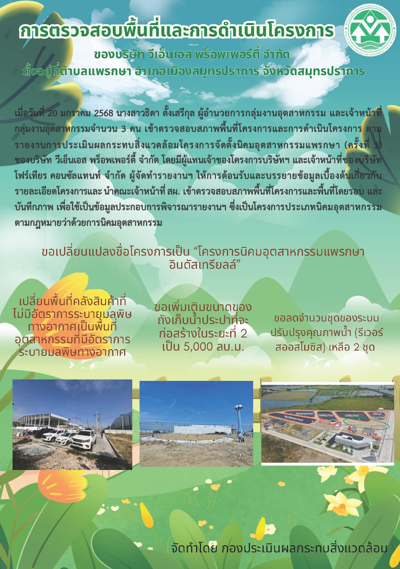การตรวจสอบพื้นที่และการดำเนินโครงการ โครงการจัดตั้งนิคมอุตสาหกรรมแพรกษา (ครั้งที่ 3) ของบริษัท วี เอ็นเอส พร็อพเพอร์ตี้ จำกัด