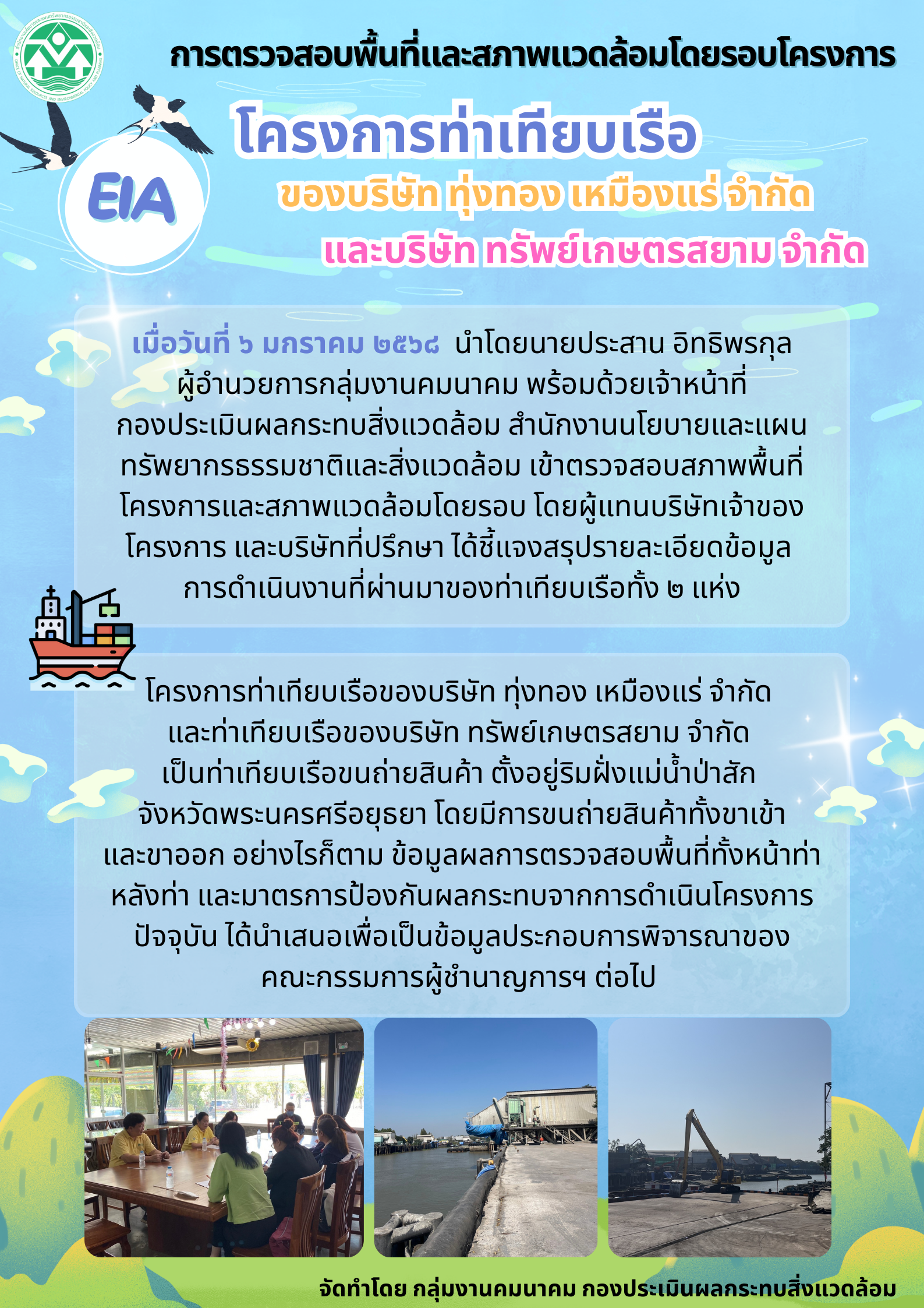 ตรวจสอบสภาพพื้นที่และสภาพแวดล้อมโดยรอบ โครงการท่าเทียบเรือของบริษัท ทุ่งทอง เหมืองแร่ จำกัด และท่าเทียบเรือ ของบริษัท ทรัพย์เกษตรสยาม จำกัด
