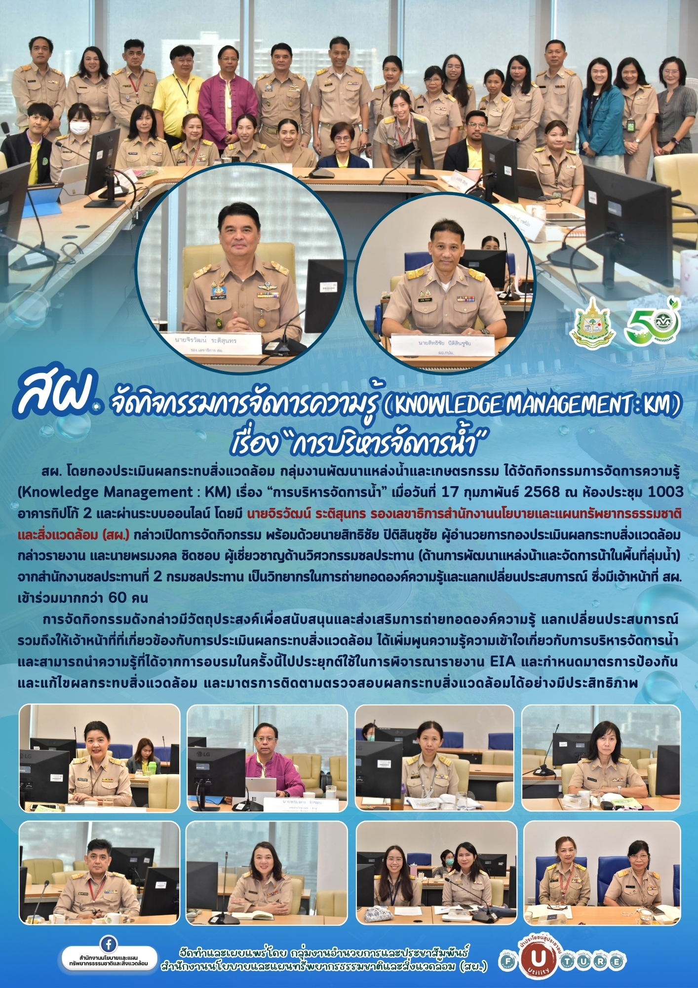 สผ. โดยกองประเมินผลกระทบสิ่งแวดล้อม กลุ่มงานพัฒนาแหล่งนํ้าและเกษตรกรรม ได้จัดกิจกรรมการจัดการความรู้ (Knowledge Management : KM) เรื่อง "การบริหารจัดการน้ำ"