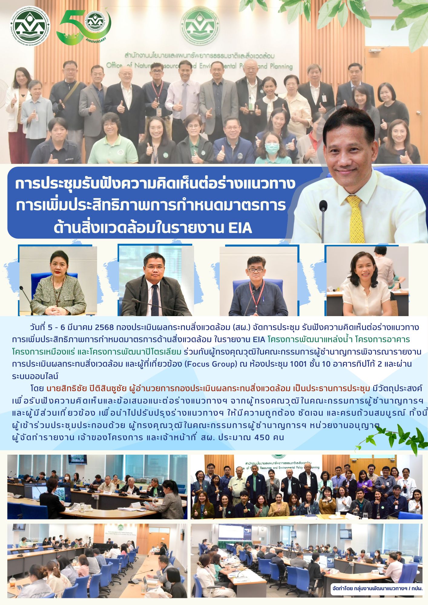 วันที่ 5 - 6 มีนาคม 2568 กองประเมินผลกระทบสิ่งแวดล้อม (สผ.) จัดการประชุมรับฟังความคิดเห็นต่อร่างแนวทางการเพิ่มประสิทธิภาพการกำหนดมาตรการด้านสิ่งแวดล้อม ในรายงาน EIA