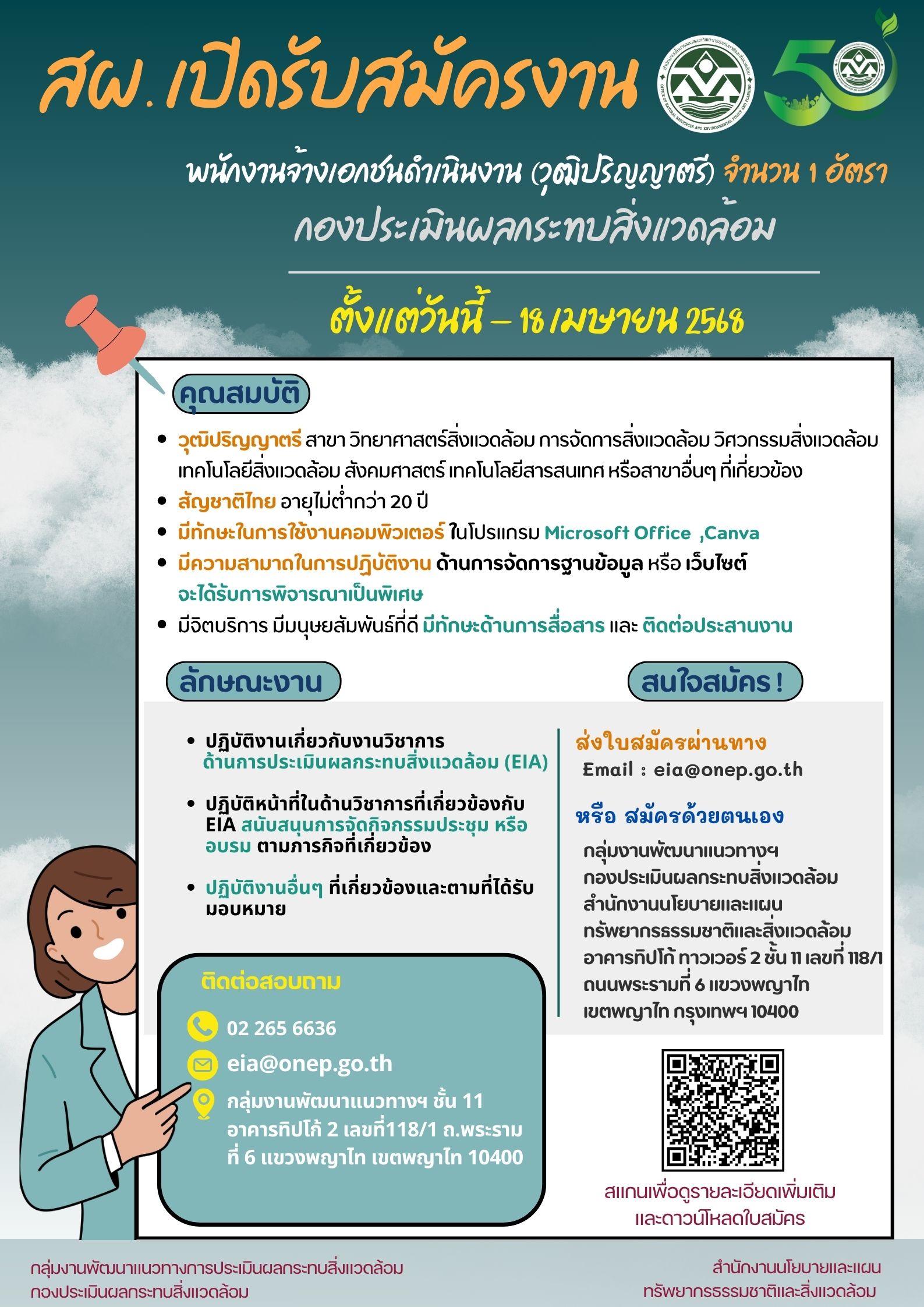 สำนักงานนโยบายและแผนทรัพยากรธรรมชาติและสิ่งแวดล้อม กองประเมินผลกระทบสิ่งแวดล้อม (กลุ่มงานพัฒนาแนวทางการประเมินผลกระทบสิ่งแวดล้อม) เปิดรับสมัครพนักงานจ้างเอกชนดำเนินงาน ปฏิบัติงานด้านวิชาการ (วุฒิปริญญาตรี) จำนวน 1 อัตรา