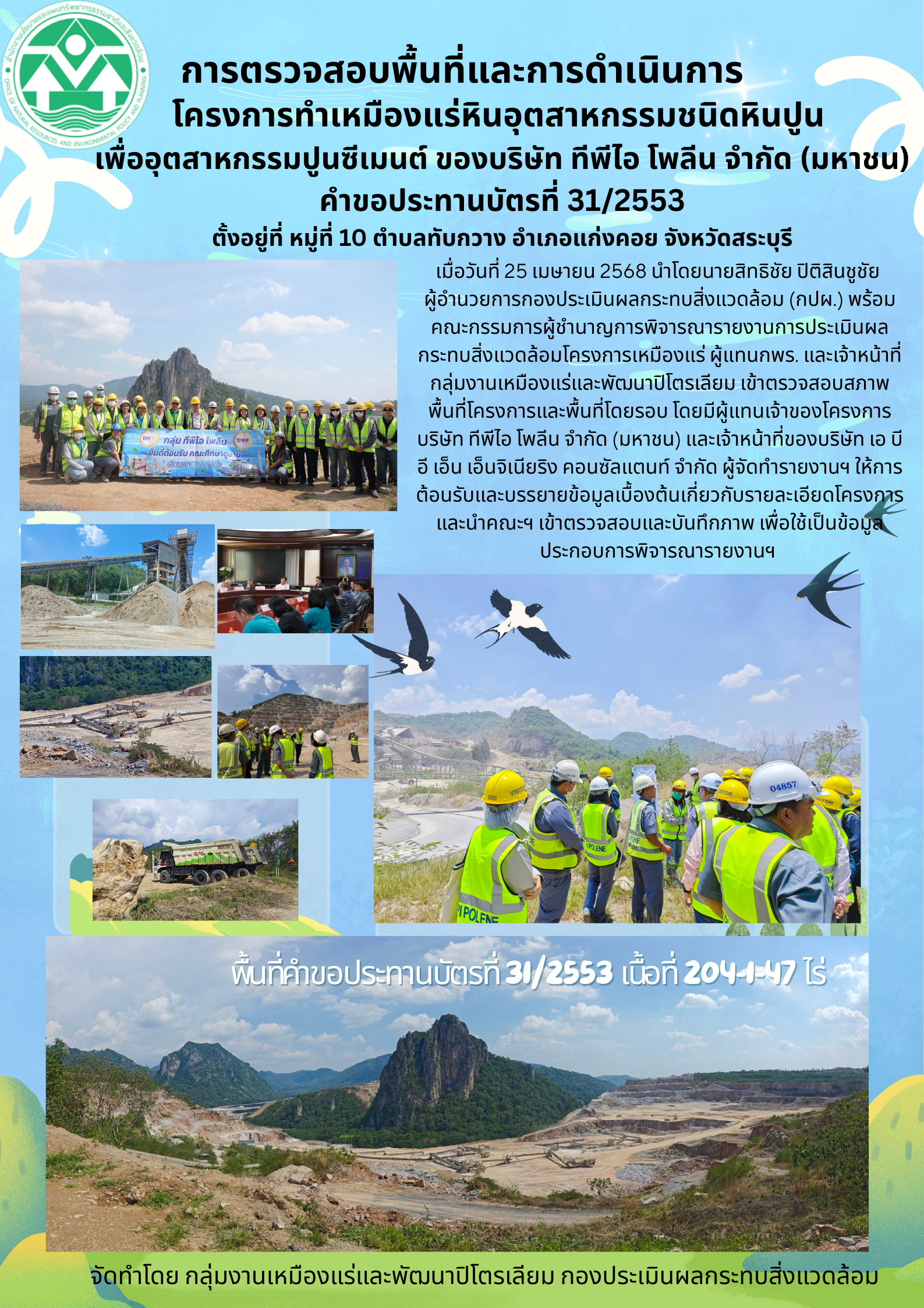 การตรวจสอบพื้นที่และการดำเนินการโครงการทำเหมืองแร่หินอุตสาหกรรมชนิดหินปูน เพื่ออุตสาหกรรมปูนซีเมนต์ ของบริษัท ทีพีไอ โพลีน จำกัด (มหาชน)