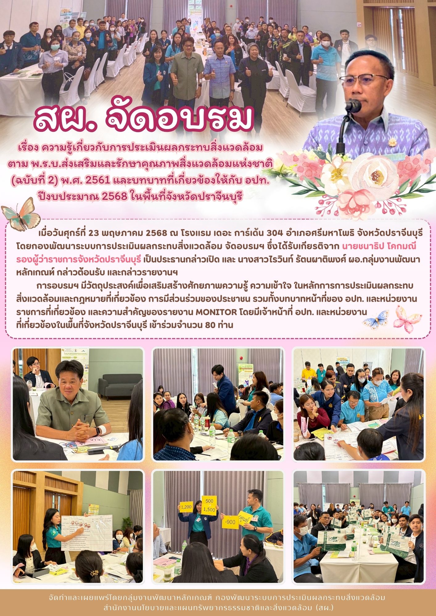 สผ. จัดอบรม เรื่องความรู้เกี่ยวกับการประเมินผลกระทบสิ่งแวดล้อม ตาม พ.ร.บ.ส่งเสริมและรักษาคุณภาพสิ่งแวดล้อมแห่งชาติ (ฉบับที่ 2) พ.ศ.2561 และบทบาทที่เกี่ยวข้องให้กับ อปท. ปีงบประมาณ 2568 ในพื้นที่จังหวัดปราจีนบุรี