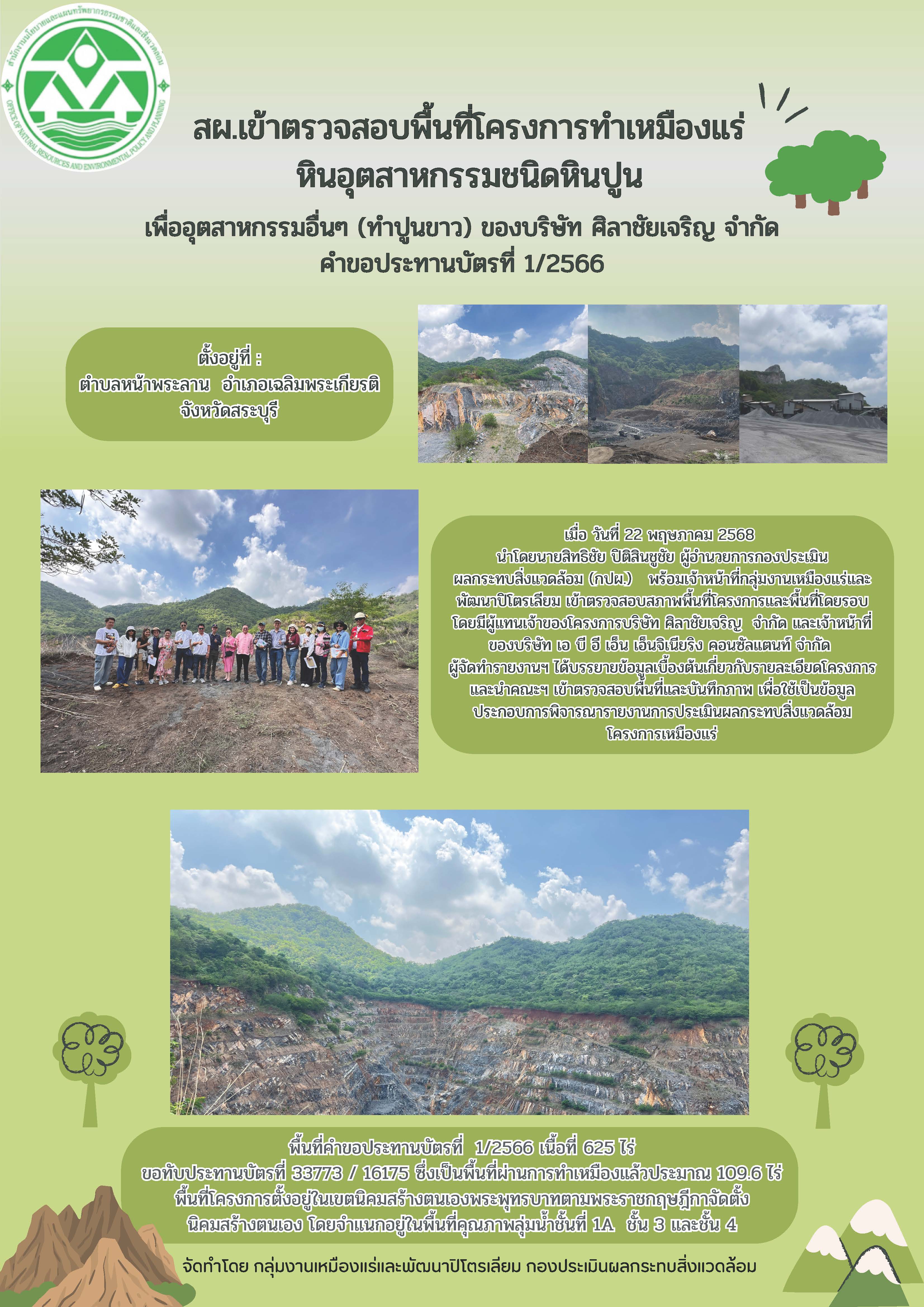 การตรวจสอบพื้นที่โครงการทำเหมืองแร่หินอุตสาหกรรมชนิดหินปูน เพื่ออุตสาหกรรมอื่นๆ (ทำปูนขาว) ของบริษัท ศิลาชัยเจริญ จำกัด