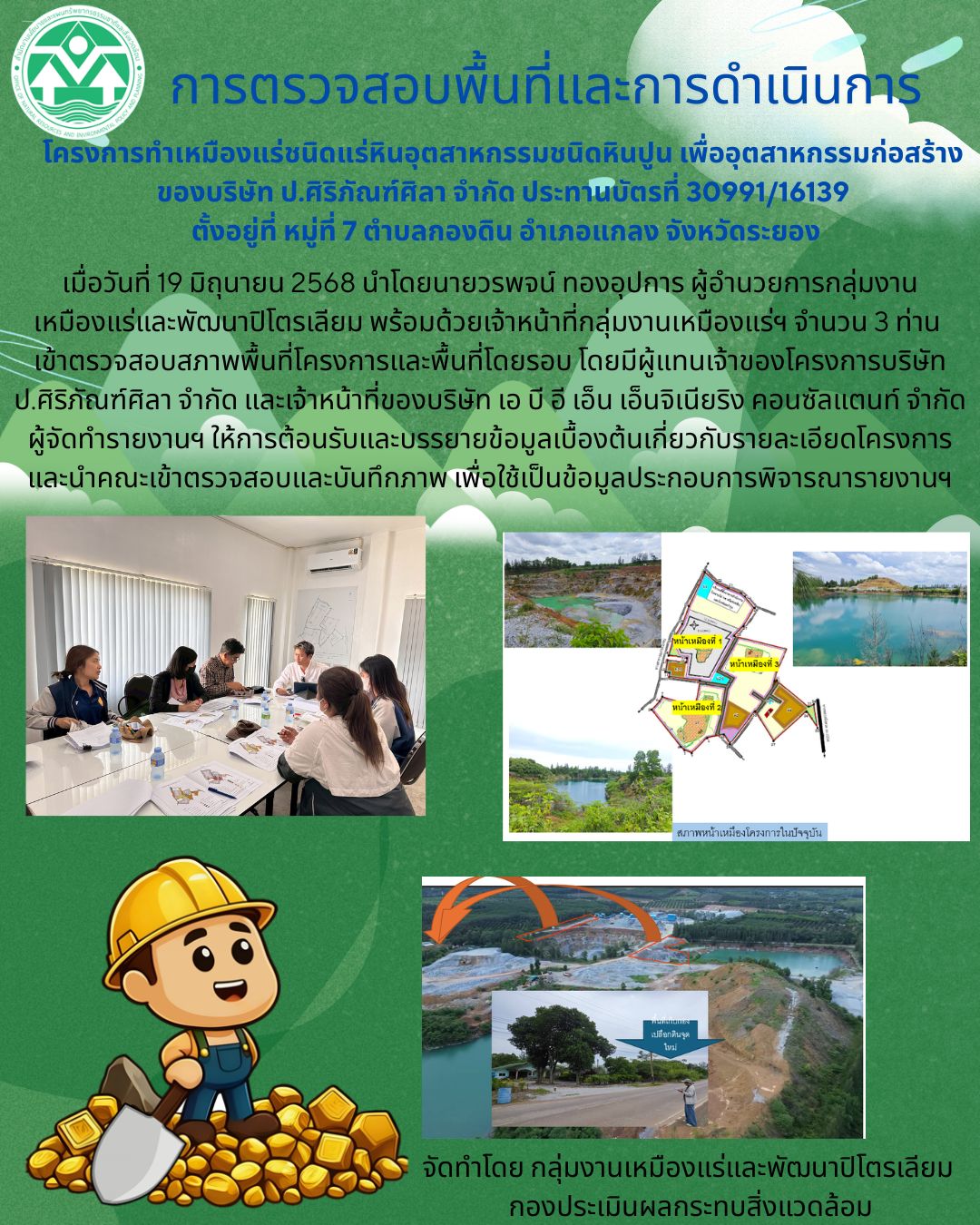 การตรวจสอบพื้นที่และการดำเนินโครงการทำเหมืองแร่ชนิดหินอุตสาหกรรมชนิดหินปูน เพื่ออุตสาหกรรมก่อสร้าง ของบริษัท ป.ศิริภัณฑ์ศิลา จำกัด ประทานบัตรที่ 30991/16139