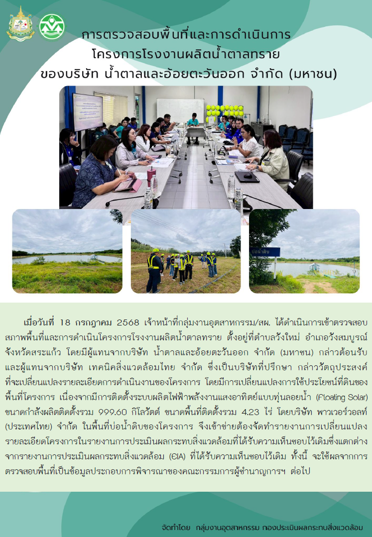 การตรวจพื้นที่และการดำเนินการโครงการโรงงานผลิตน้ำตาลทราย (ครั้งที่ 1) ของบริษัท น้ำตาลและอ้อยตะวันออก จำกัด (มหาชน)