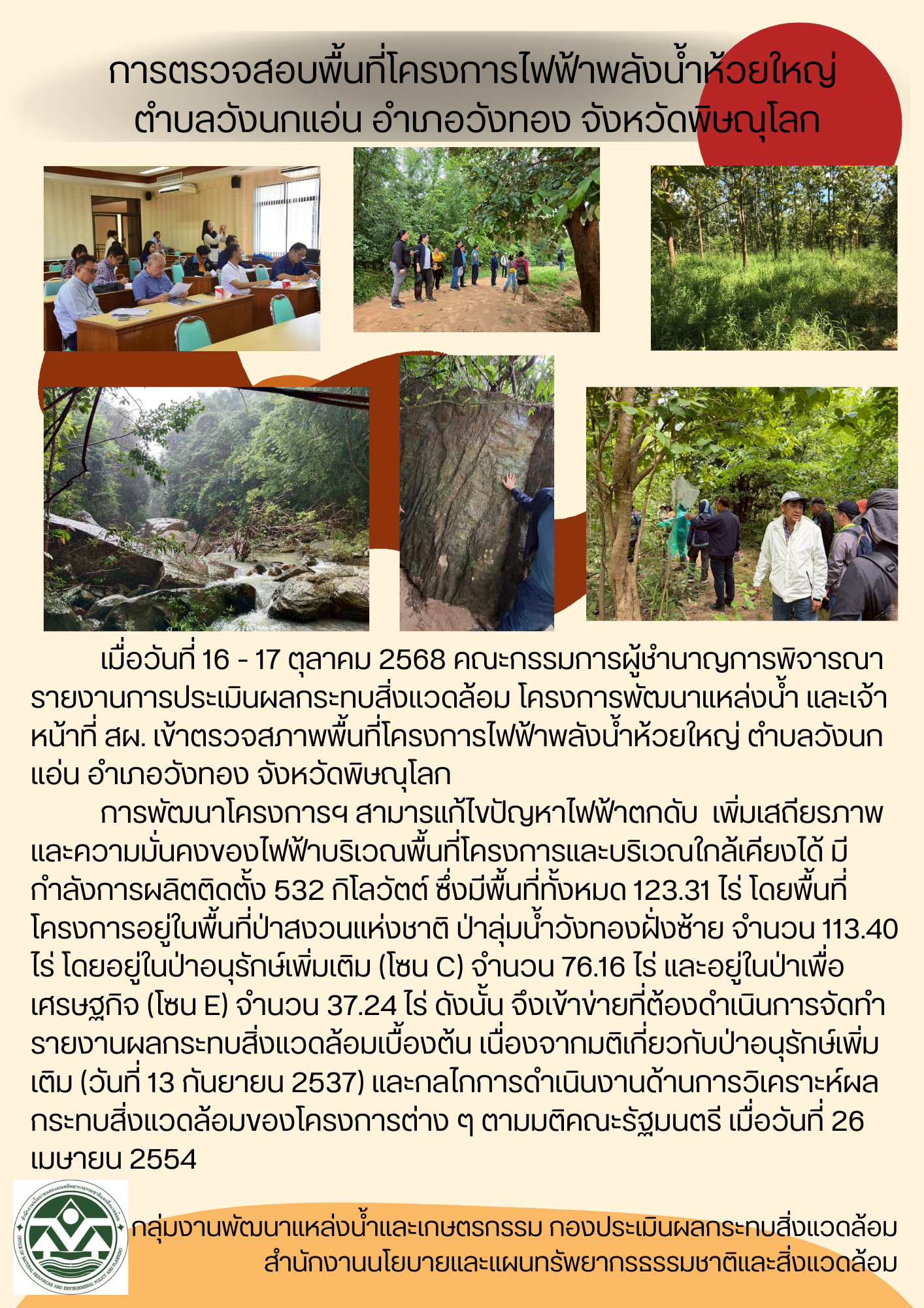 การตรวจสอบพื้นที่โครงการไฟฟ้าพลังน้ำห้วยใหญ่ ตำบลวังนกแอ่น อำเภอวังทอง จังหวัดพิษณุโลก เมื่อวันที่ 16-17 ตุลาคม 2568