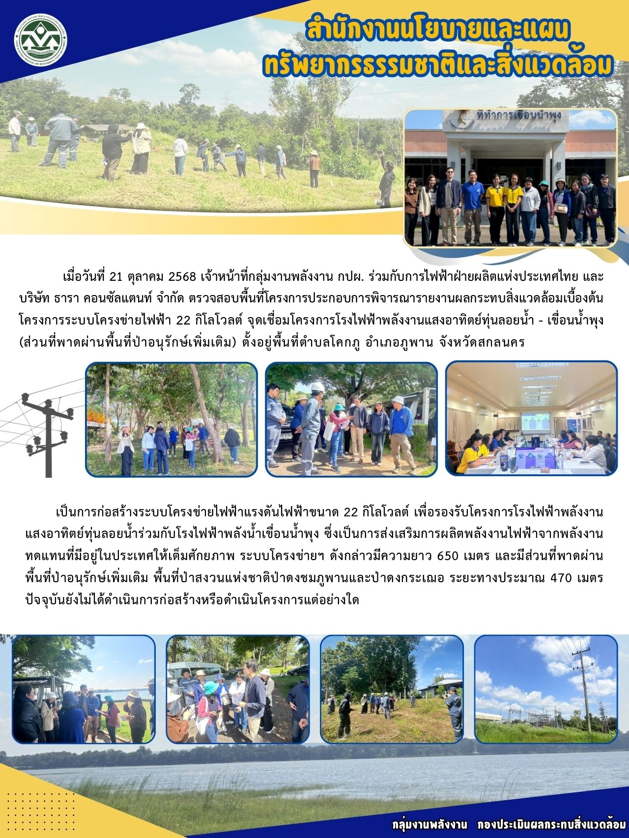 การตรวจสอบพื้นที่โครงการระบบโครงข่ายไฟฟ้า 22 กิโลโวลต์ จุดเชื่อมโครงการโรงไฟฟ้าพลังงานแสงอาทิตย์ทุ่นลอยน้ำ - เขื่อนน้ำพุง (ส่วนที่พาดผ่านพื้นที่ป่าอนุรักษ์เพิ่มเติม) ของการไฟฟ้าฝ่ายผลิตแห่งประเทศไทย เมื่อวันที่ 21 ตุลาคม 2568