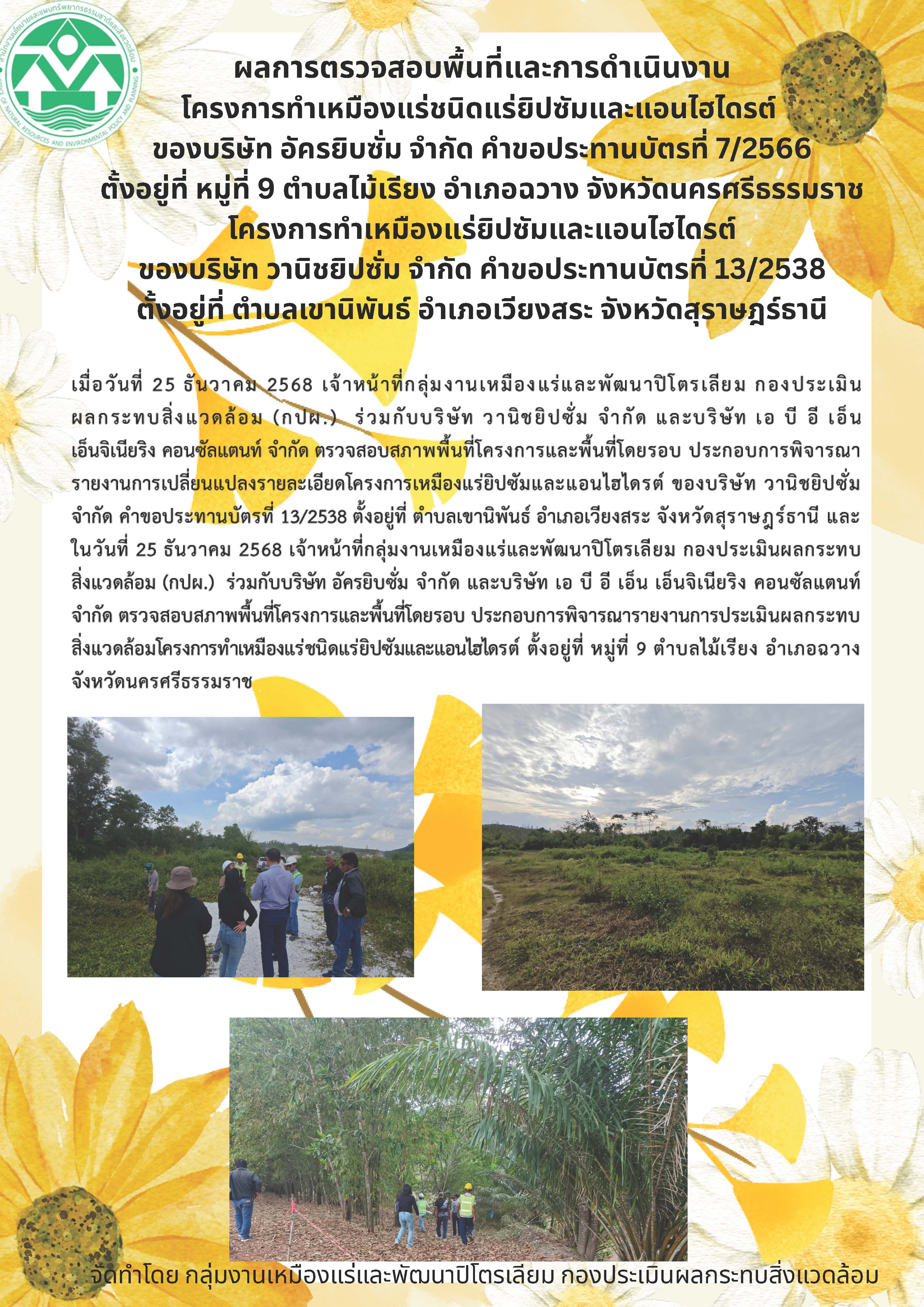กลุ่มงานเหมืองแร่และพัฒนาปิโตรเลียม กปผ. ได้ขอเข้าตรวจสอบพื้นที่และการดำเนินโครงการทำเหมืองแร่ชนิดแร่ยิปซั่มและแอนไฮไดรต์