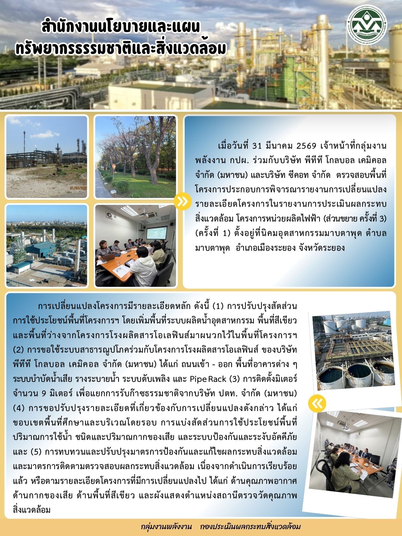 การตรวจสอบพื้นที่โครงการประกอบการพิจารณารายงานการขอเปลี่ยนแปลงรายละเอียดโครงการในรายงานการประเมินผลกระทบสิ่งแวดล้อม โครงการหน่วยผลิตไฟฟ้า (ส่วนขยาย ครั้งที่ 3) (ครั้งที่ 1) ของบริษัท พีทีที โกลบอล เคมิคอล จำกัด (มหาชน)