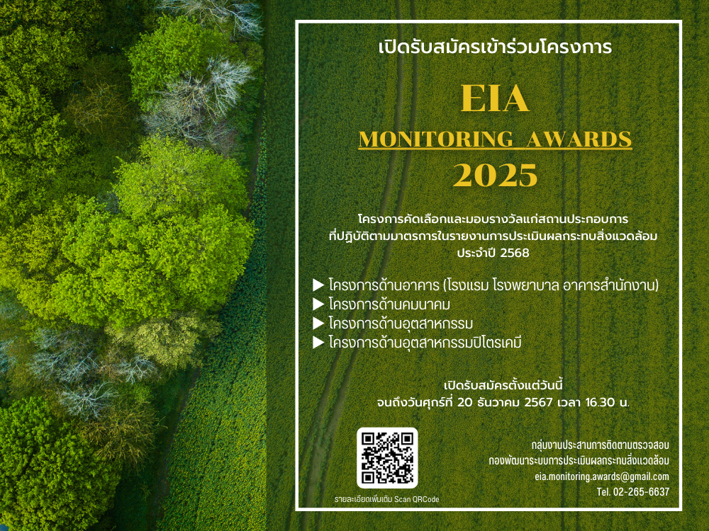 เชิญชวนสถานประกอบการสมัครเข้าร่วมโครงการคัดเลือกและมอบรางวัลแก่สถานประกอบการที่ปฏิบัติตามมาตรการในรายงานการประเมินผลกระทบสิ่งแวดล้อม ประจำปี 2568 (EIA Monitoring Awards 2025)