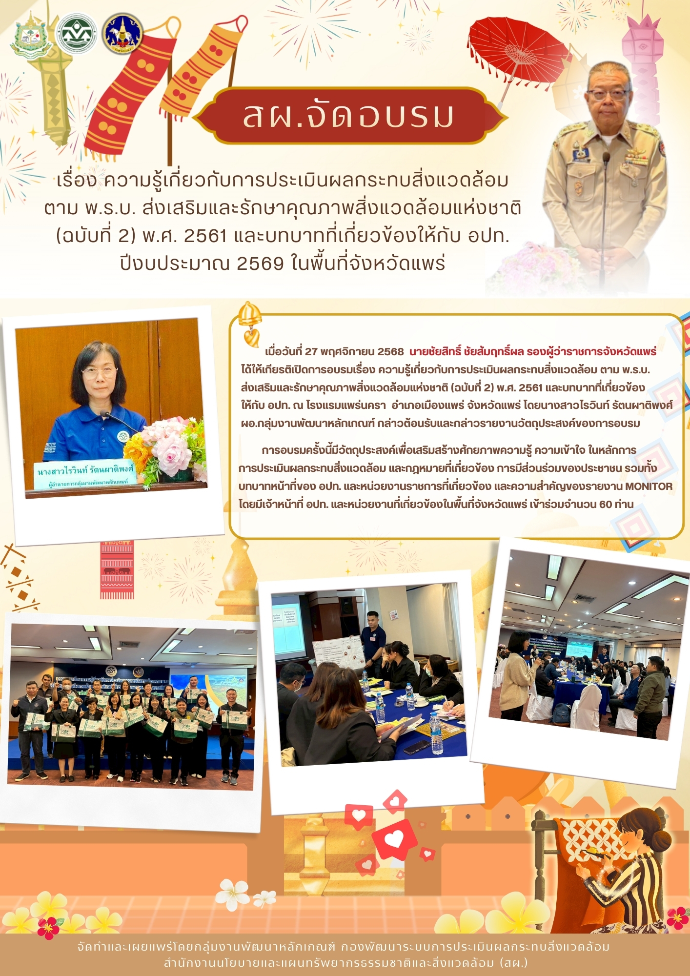 การอบรมให้ความรู้เกี่ยวกับการประเมินผลกระทบสิ่งแวดล้อม ตาม พ.ร.บ. ส่งเสริมและรักษาคุณภาพสิ่งแวดล้อมแห่งชาติ (ฉบับที่ 2) พ.ศ. 2561 และบทบาทที่เกี่ยวข้องให้กับ อปท. ในพื้นที่จังหวัดแพร่