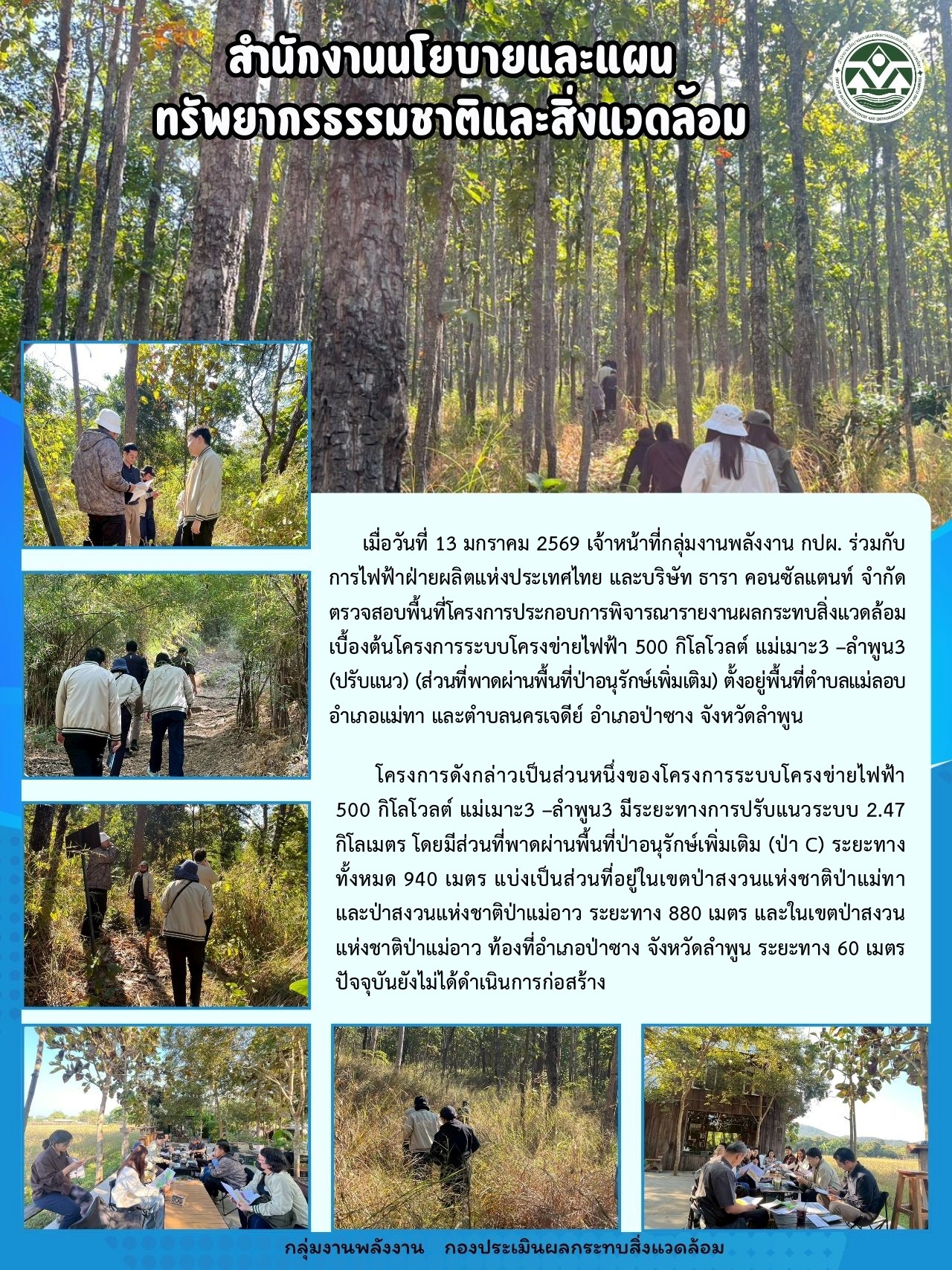 ตรวจสอบพื้นที่โครงการประกอบการพิจารณารายงานผลกระทบสิ่งแวดล้อมเบื้องต้น โครงการระบบโครงข่ายไฟฟ้า 500 กิโลโวลต์ แม่เมาะ3 - ลำพูน3 (ปรับแนว) (ส่วนที่พาดผ่านพื้นที่ป่าอนุรักษ์เพิ่มเติม) เมื่อวันที่ 13 มกราคม 2569