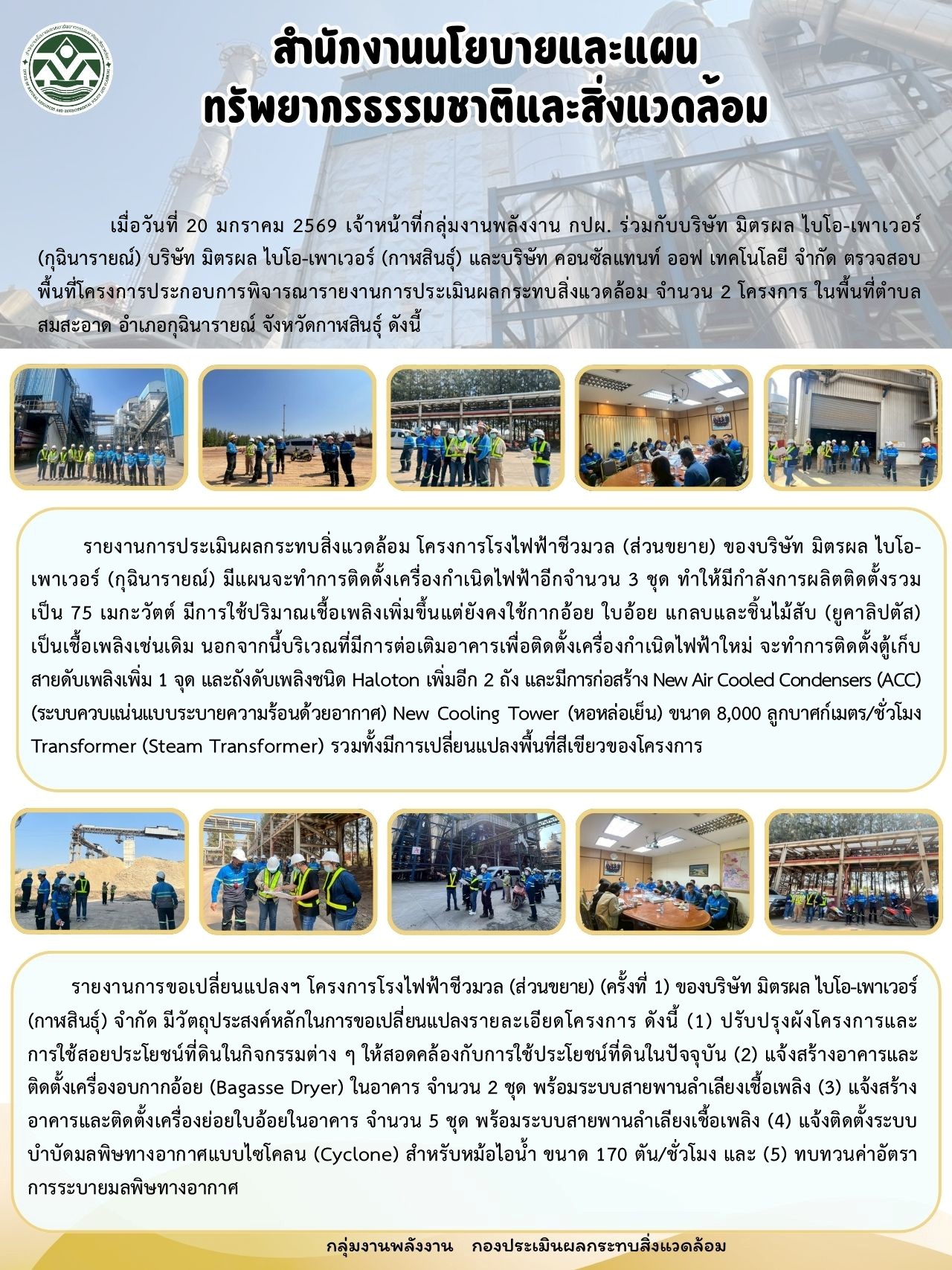 ตรวจสอบพื้นที่โครงการประกอบการพิจารณารายงานการประเมินผลกระทบสิ่งแวดล้อม โครงการโรงไฟฟ้าชีวมวล (ส่วนขยาย) ของบริษัท มิตรผลไบโอ-เพาเวอร์ (กุฉินารายณ์) จำกัด และรายงานการขอเปลี่ยนแปลงรายละเอียดโครงการในรายงานการประเมินผลกระทบสิ่งแวดล้อม โครงการโรงไฟฟ้าชีวมวล (ส่วนขยาย) ครั้งที่ 1 ของบริษัท มิตรผล ไบโอ-เพาเวอร์ (กาฬสินธุ์) จำกัด เมื่อวันที่ 20 มกราคม 2569